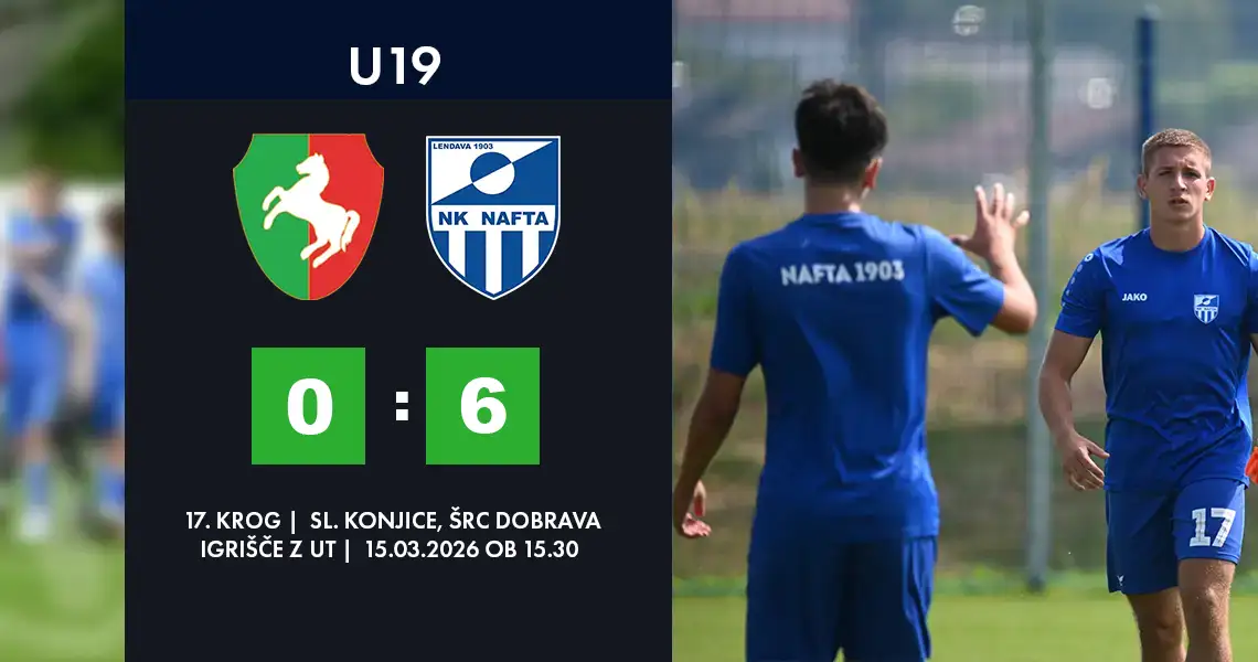 Nogometaši Nafta 1903 U19 so v 17. krogu prvenstva v Slovenskih Konjicah prikazali zelo prepričljivo predstavo. Na igrišču z umetno travo v ŠRC Dobrava so proti Dravinji slavili z visoko zmago 0:6 in s tem potrdili dobro formo na začetku nadaljevanja prvenstva. Ekipa trenerja Gregorja Bunca je tekmo nadzorovala od prvega zadetka naprej in z učinkovito igro v napadu postopoma zgradila visoko prednost.