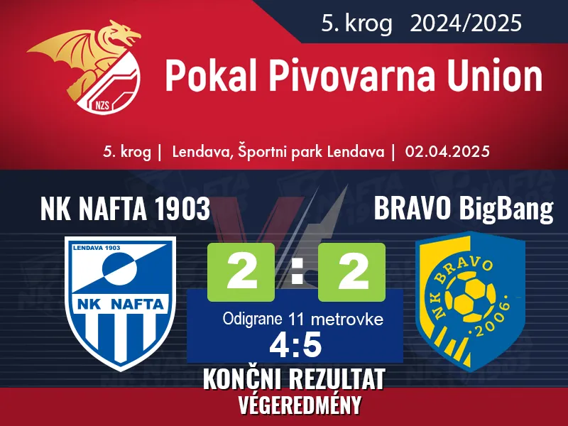 V Lendavi je bilo vse nared za veliki pokalni obračun – četrtfinale Pokala Pivovarna Union med Nafto 1903 in ljubljanskim Bravom Big Bang. Tekma, ki bi si zaslužila štadion brez praznega sedeža, je v resnici spremljalo le 400 gledalcev, a tisti, ki so prišli, so dobili nogometno srhljivko z dvema podaljškoma, rdečim kartonom in loterijo enajstmetrovk. Na koncu pa – mrk v najpomembnejšem trenutku.